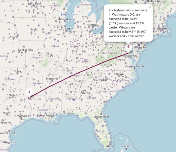The first scenario that users can search is similar to our current trajectory and assumes very high greenhouse gas emissions, in which the planet is on track to warm around 9 degrees F by the end of this century. This scenario would make the earth warmer than it likely has been in millions of years. The second scenario is similar to what the planet would feel like if nations pursue Paris Climate Accord goals. Under that scenario, the planet warms by about 3 degrees F by immediately and drastically reducing human-caused greenhouse gases emissions.