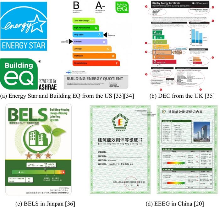 ENERGY GRADING AND LABELING TOOLS. A ENERGY STAR AND BUILDING EQ FROM THE US ((AGENCY AND HISTORY OF EPA'S CLIMATE PARTNERSHIP PROGRAMS. 2022; ASHRAE. BUILDING E.Q. 2022)). B DEC FROM THE UK (DEPARTMENT OF FINANCE. DISPLAY ENERGY CERTIFICATES 2022). C BELS IN JANPAN (CENTER AND OF JAPAN. BELS EVALUATION. 2022). D EEEG IN CHINA (MINISTRY OF HOUSING AND URBAN-RURAL DEVELOPMENT. NOTICE ON THE TRIAL IMPLEMENTATION OF THE ENERGY EFFICIENCY EVALUATION AND GRADING SYSTEM FOR CIVIL BUILDINGS 2008)