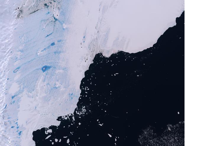 POOLED MELTWATER AND SLUSH ON THE TRACY TREMENCHUS ICE SHELF, WHICH FLOWS INTO THE SOUTHERN OCEAN. CONTAINS MODIFIED COPERNICUS SENTINEL DATA [2018], PROCESSED BY REBECCA DELL