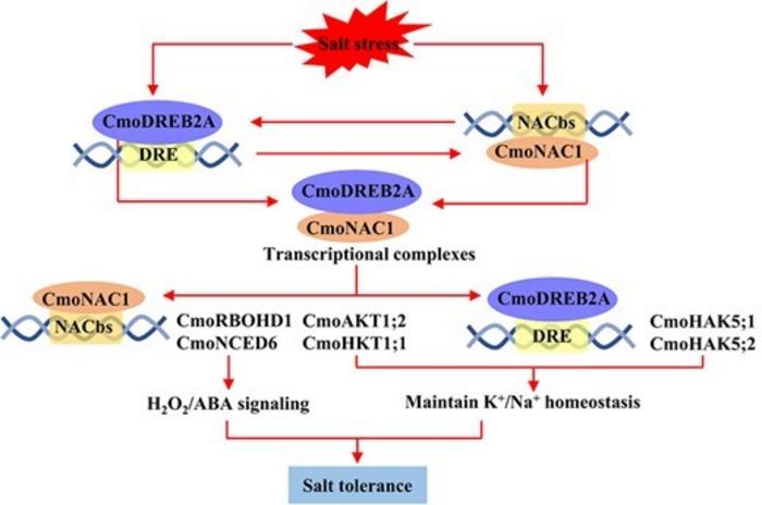 THE UNDERLYING MECHANISM OF THE INTERACTION BETWEEN CMODREB2A AND CMONAC1 IN REGULATING SALT TOLERANCE OF GRAFTED CUCUMBERS. BOTH CMODREB2A AND CMONAC1 ARE CAPABLE OF BINDING TO EACH OTHER’S PROMOTERS. THE TRANSCRIPTIONAL COMPLEXES FORMED BY CMODREB2A AND CMONAC1 NOT ONLY ENHANCE THE BINDING AFFINITY OF CMONAC1 TO THE CMORBOHD1 AND CMONCED6 PROMOTERS, LEADING TO INCREASED PRODUCTION OF H2O2 AND ABA, BUT ALSO FACILITATE THE BINDING OF CMONAC1 TO THE CMOAKT1;2 AND CMOHKT1;1 PROMOTER AND THE BINDING OF CMODREB2A TO THE CMOHAK5;1 AND CMOHAK5;2 PROMOTER, THEREBY PROMOTING K+/NA+ HOMEOSTASIS.