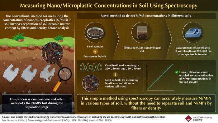 To this end, a team of researchers led by Mr. Kyouhei Tsuchida from Waseda University and National Institute of Advanced Industrial Science and Technology, along with Dr. Yukari Imoto, Dr. Takeshi Saito, and Dr. Junko Hara from the National Institute of Advanced Industrial Science and Technology and Dr. Yoshishige Kawabe, also from Waseda University, devised a novel and simple method to measure N/MP concentrations in soil using spectroscopy without separating the soil organic matter. Spectroscopy can determine the concentration of N/MPs in soils based on how much light of a particular wavelength passes through the sample and how much gets absorbed. In this way, spectroscopy can potentially detect N/MPs regardless of size, provided the correct wavelengths are used to distinguish between the N/MPs and soil. Accordingly, the researchers developed a method to use the difference between the absorbance spectra of N/MPs and soil particles to quantify the N/MPs. Their findings were published in Ecotoxicology and Environmental Safety journal on 28 May 2024.