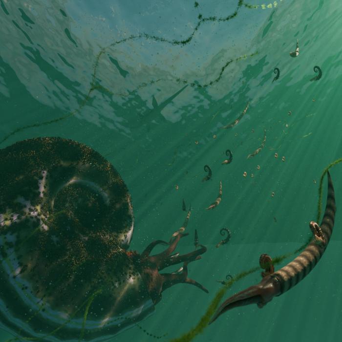Ammonites basking under the Late Cretaceous sun. Artwork by Callum Pursall (@cpursall on X) |