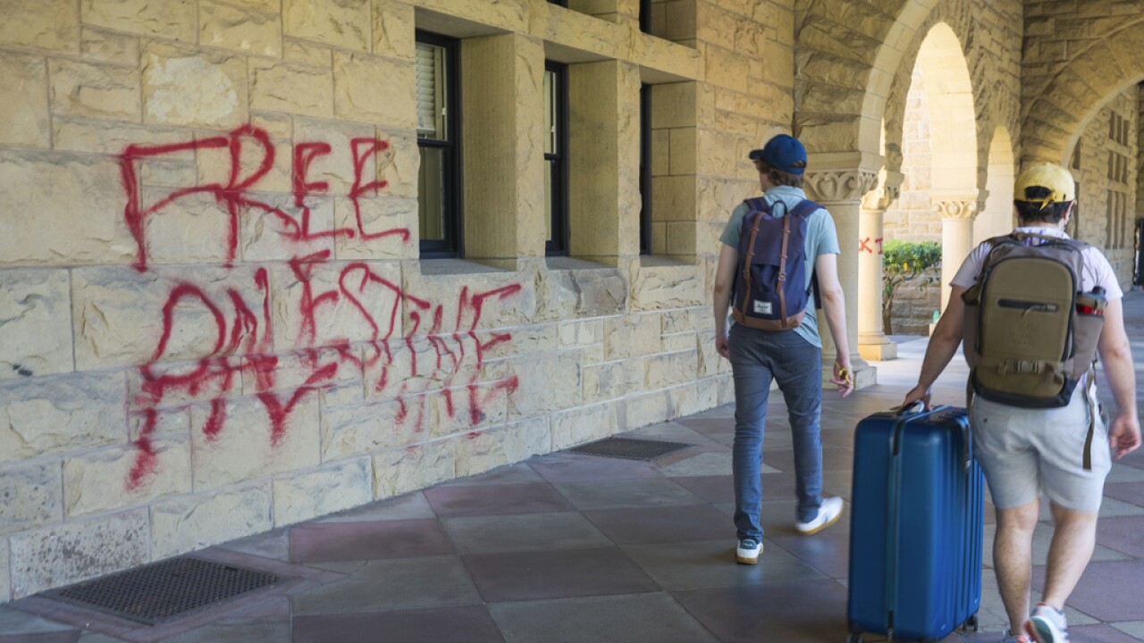 Students walk by graffiti near university president Richard Saller's office at Stanford University.
