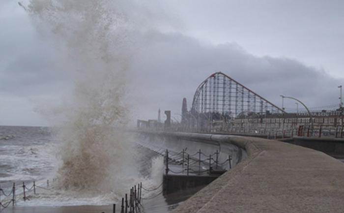 Waves topping over sea wall in Blackpool, UK