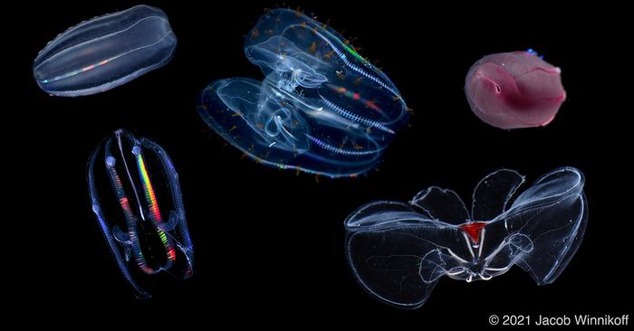 A COLLAGE OF FIVE OF THE COMB JELLY SPECIES STUDIED. RED COLORATION AS SEEN IN THE TWO SPECIMENS AT RIGHT IS COMMON AMONG DEEP-SEA ANIMALS.