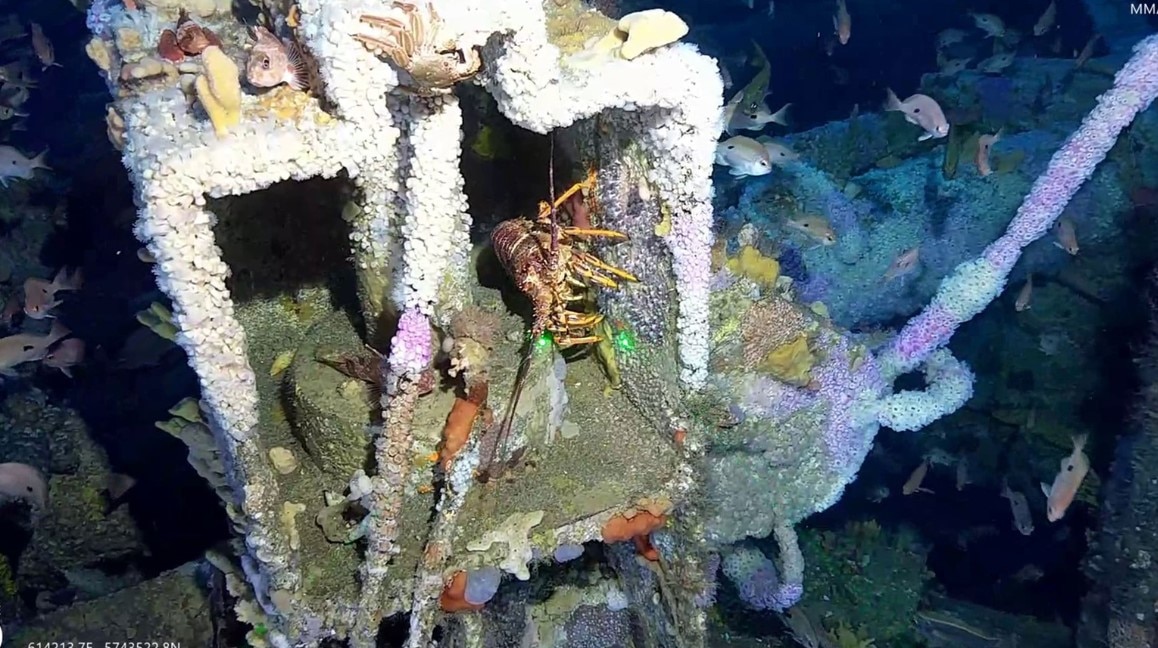 In this photo from the ExxonMobil website a lobster is seen underneath one of their platforms in the Bass Strait.(Supplied: ExxonMobil)