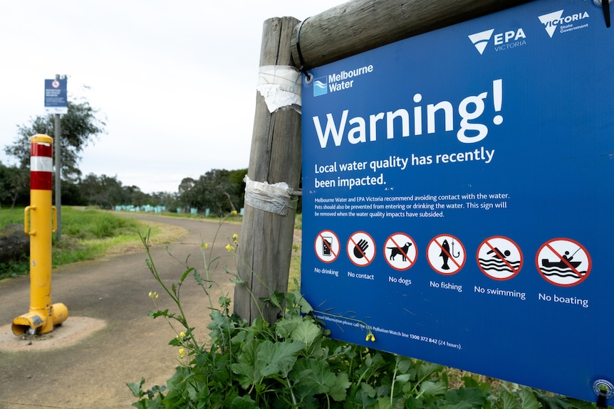 A sign at Laverton Creek warns of impacted water quality.(ABC News: Rachel Clayton)