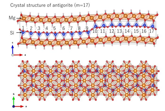 THE CRYSTAL STRUCTURE OF ANTIGORITE WITH M=17. THE NUMBER OF TETRAHEDRA WITHIN ONE WAVELENGTH ALONG THE A-AXIS REPRESENTS THE M-VALUE. ORANGE: MG, BLUE: SI, RED: O, PINK: H