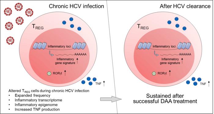 THE NUMBER OF REGULATORY T CELLS REMAINS ELEVATED IN THE PERIPHERAL BLOOD OF CHRONIC HEPATITIS C PATIENTS, AND THIS INCREASE REMAINS PERSISTENT EVEN AFTER THE COMPLETION OF TREATMENT. ANALYSIS OF THE TRANSCRIPTOME AND EPIGENOME OF PATIENTS WITH CHRONIC HEPATITIS C SHOW THAT REGULATORY T CELLS CONTINUE TO HAVE INCREASED INFLAMMATORY CHARACTERISTICS COMPARED TO NORMAL PEOPLE. THESE INFLAMMATORY TREG CELLS SHOWED HIGHER EXPRESSION LEVELS OF ACTIVATION MARKERS AND TRANSCRIPTION FACTORS SUCH AS RORΓT AND T-BET, LEADING THEM TO SECRETE INFLAMMATORY CYTOKINE TNF.