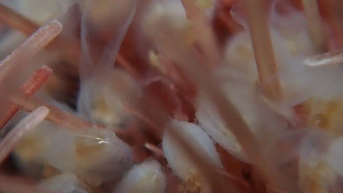 The newly discovered species, Brachiomya ducentiunus, crawing on a sea urchin spine.