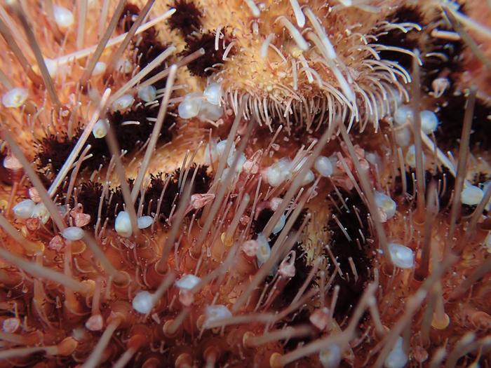 Dozens of Brachiomya ducentiunus crawling on the surface of a sea urchin.