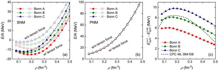THE BINDING ENERGIES PER PARTICLE FOR (A) SYMMETRIC NUCLEAR MATTER (SNM) AND (B) PURE NEUTRON MATTER (PNM) CALCULATED WITH (SOLID LINES AND FULL SYMBOLS) AND WITHOUT (DOTTED LINES AND EMPTY SYMBOLS) TENSOR FORCES. (C) THE SYMMETRY ENERGY DIFFERENCE OBTAINED BY PERFORMING THE RBHF CALCULATIONS WITH AND WITHOUT TENSOR FORCE.