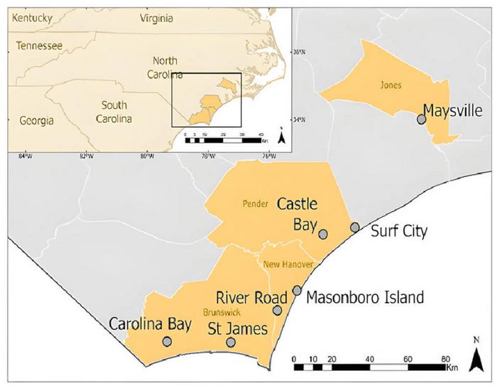 STUDY AREA IN SOUTHEASTERN NC SHOWING THE 8 COLLECTION LOCATIONS ACROSS 4 COASTAL COUNTIES.