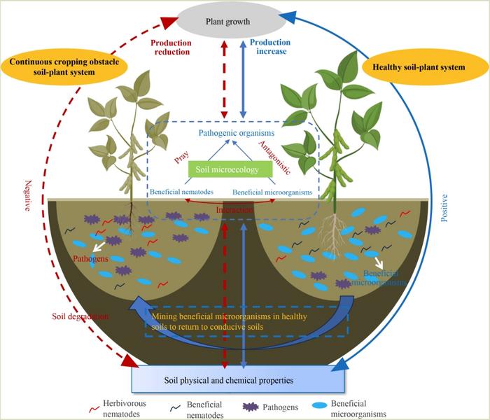To answer these questions, this article summarizes past studies. CCOs is the external manifestation of the interaction between plants, soil, microorganisms, and the environment. Soil degradation, soil ecological environment deterioration, and plant autotoxicity are the main causes of CCOs. However, not all soils will have CCOs after long-term continuous cropping. In continuous cropping, there are three main disease patterns of soil-borne diseases: (1) continuous severe type, is manifested in that the disease becomes more serious and the crop yield continues to decrease during the entire continuous cropping process; ( 2) late relief type, is manifested in that the soil-borne diseases are serious in the early stage of continuous cropping, and the disease-suppressing soil is formed in the late stage of continuous cropping, and the soil-borne diseases are alleviated; (3) continuous fluctuation type, is manifested in the alternation of severe disease period and disease relief period during continuous cropping. The rhizobiont theory emphasizes that nutrient efficiency is a process of synergistic interaction and improvement of multi-interface systems from soil to soil organisms to plants. Therefore, to solve the problem of CCOs, it is necessary to reduce from the system level by regulating the cascade amplification effect of the various interfaces of the rhizosphere. Through reasonable water and fertilizer management, optimized planting structure, conservation tillage, soil biological regulation, and other measures, the soil micro-food web structure can be regulated to achieve the reduction of CCOs. This paper summarizes the pathogenesis of soil-borne diseases in continuous cropping soils, and proposes that it is necessary to start from the system perspective of plant–soil–soil biological interactions and prevent soil-borne diseases in a targeted manner to achieve the reduction of continuous cropping obstacles. This study has been published on the Journal of Frontiers of Agricultural Science and Engineering in Vol. 11, No. 2, 2024, DOI: 10.15302/J-FASE-2024543.