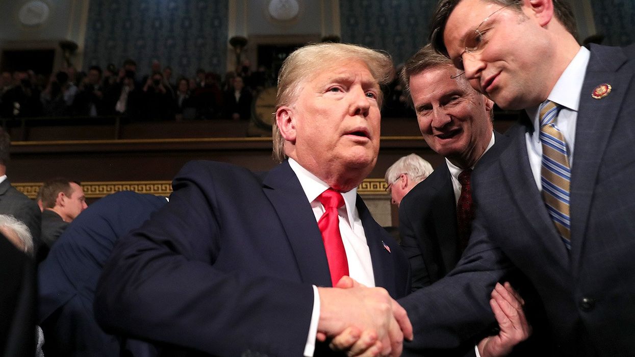 Donald Trump is greeted by Rep. Mike Johnson (R-LA) before the State of the Union address in the House chamber on February 4, 2020 in Washington, DC.