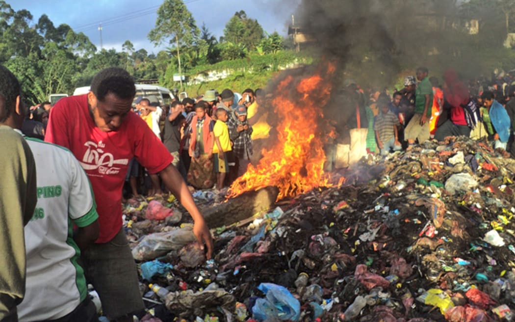 A photo taken on 6 February 2013 shows a crowd watching as a young mother accused of sorcery, is stripped naked, reportedly tortured with a branding iron, tied up, splashed with fuel and set alight on a pile of rubbish topped with car tyres, in Mount Hagen city in the Western Highlands of Papua New Guinea. Photo: AFP / Post Courier