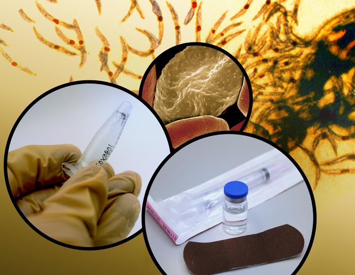 Background image of malaria parasites with foreground photo montage showing infected red blood cell, mosquito, and vaccine vial.