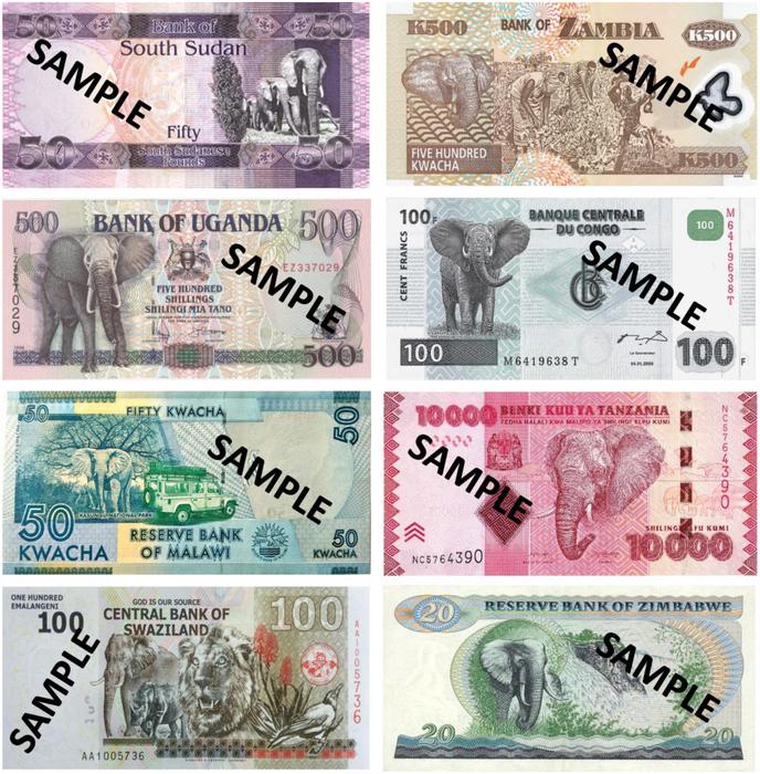Examples of the most widespread (i.e., largest number of countries) species depicted on banknotes, the African savanna elephant, Loxodonta africana.