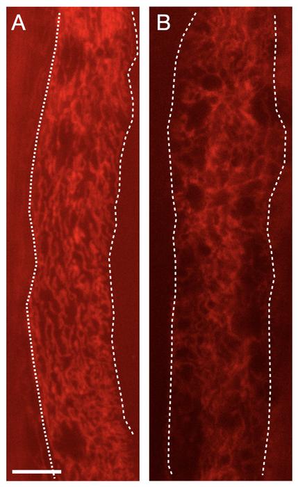 Intestinal mitochondria in C. elegans are stained red. At left, a wild-type nematode exhibits a normal abundance of mitochondria. In the nematode at right, with its pathogen-associated circuit activated, the mitochondria are depleted. A new UC Berkeley study links activation of smell neurons by pathogen odors to mitochondrial depletion, called mitophagy.