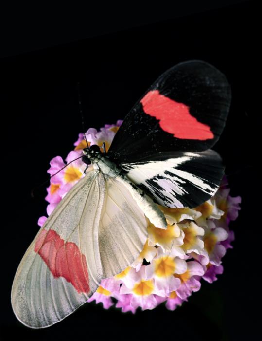 Depicted is a longwing butterfly resting on a Lantana flower. Its wing patterns have been modified through CRISPR gene editing, which removed a crucial RNA molecule, leading to a loss of melanic scales.