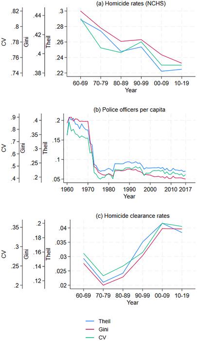 Spatial inequality measure for commuting zones (1960–2019). Inequality in homicides (NCHS), policing, and homicide clearance rates.