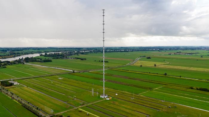 The measurements of HFC-23 and other by-products of Teflon manufacture, and of the emitted tracer gas were carried out at the Cabauw tall tower in the Netherlands. The 213-meter mast, as pictured, is operated by the Royal Netherlands Meteorological Institute (KNMI).