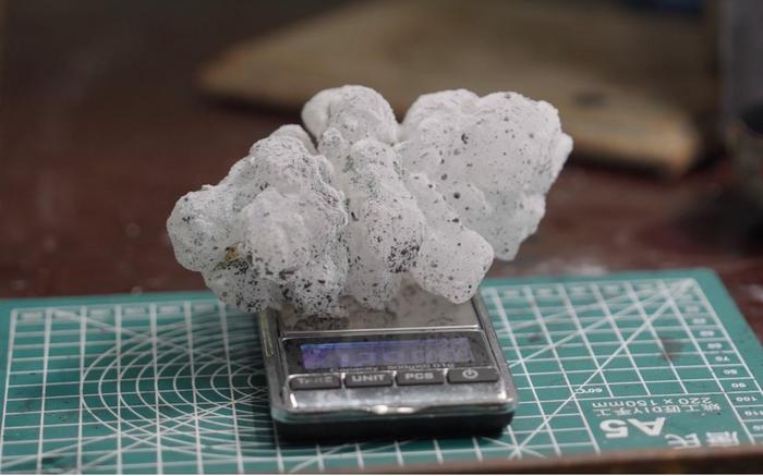 A hailstone, flecked with black paint to assist in 3D scanning, is weighed as part of processing for the library.