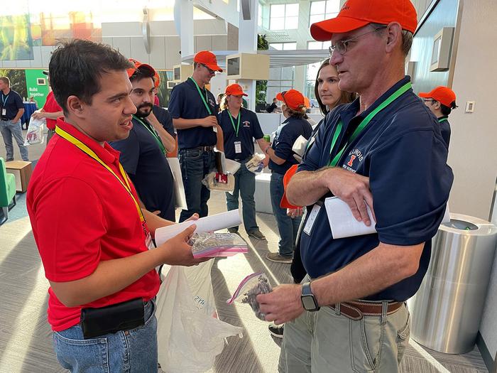 From left: Felipe Faleco, University of Wisconsin-Madison, hands a bag of PPO-resistant giant ragweed seeds to Pat Tranel, University of Illinois Urbana-Champaign. The team identified the first cases of multiple-herbicide-resistant giant ragweed in Wisconsin and the first ever incidence of Group 14-resistance in these weeds.