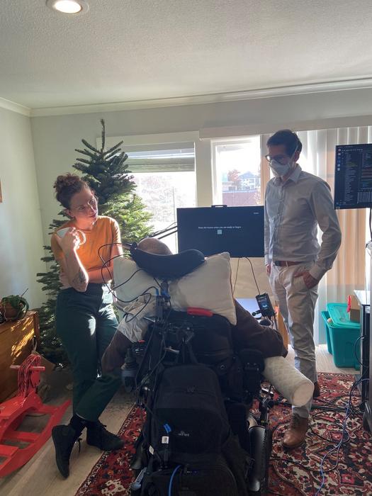 Casey Harrell with his personal assistant Emma Alaimo and UC Davis neuroscientist Sergey Stavisky