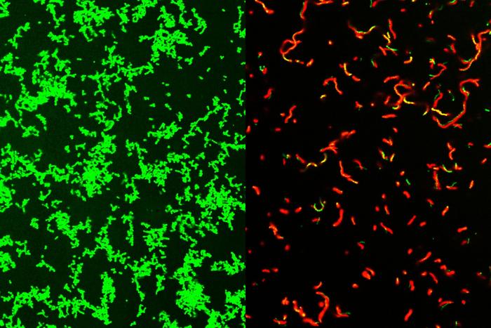 Researchers at Washington University School of Medicine in St. Louis have developed a compound that is effective against common bacteria that can lead to rare, dangerous illnesses. This image shows untreated Streptococcus pyogenes bacterial culture full of healthy microbes, labeled green (left). After treatment by GmPcide, the dish is full of dead bacteria (red; right).