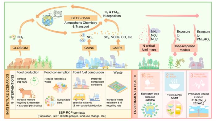 Fig.1 An integrated modeling framework evaluates how ambitious nitrogen interventions can reduce ammonia and nitrogen emissions, consequently improve air quality by lowering fine particulate matter and ozone levels, and decrease nitrogen deposition, ultimately benefiting the environment and public health.