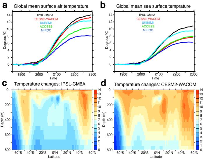 Transients in temperature state of CMIP6 models under extended simulations. Evolution of changes in temperature relative to the respective 1850-1899 mean for (A) globally-averaged 2m air temperature, and (B) globally-averaged sea surface temperature for five CMIP6 models run to 2300 under historical/SSP5-8.5 forcing. Changes in zonally averaged potential temperature between a 1990s climatology and a 2290s climatology for two of the models: (C) IPSL-CM6A and (D) CESM2-WACCM. The units for all panels are °C.