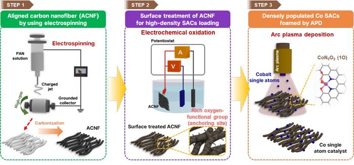 High-performance Co single-atom catalyst supported on carbon nanofibers developed by KIST researchers through a dry-based arc plasma deposition process.