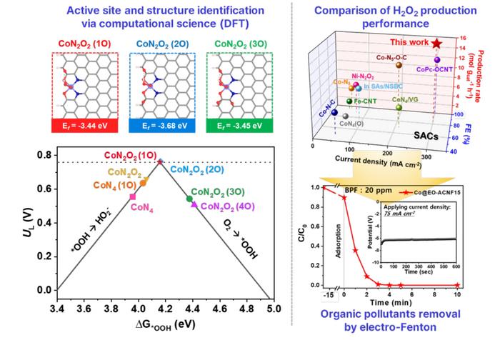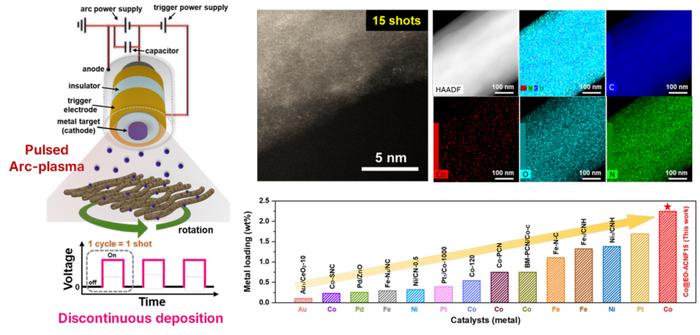 Dr. Jong Min Kim of the Materials Architecturing Research Center, Dr. Sang Soo Han of the Computational Science Research Center, Dr. Sang Hoon Kim of the Extreme Materials Research Center at Korea Institute of Science and Technology (KIST), and Professor Byeong-Kwon Ju of the School of Electrical Engineering at Korea University have fabricated high-performance cobalt single-atom catalysts through a chemical-free and environmentally friendly dry-based arc plasma deposition process. The team applied it to an electro-Fenton process based on electrochemical hydrogen peroxide synthesis to remove harmful bisphenols from aqueous solutions in a short time.