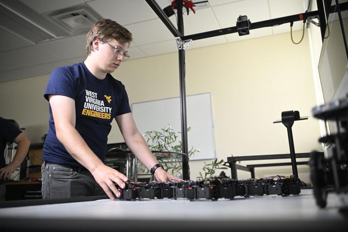 In Yu Gu’s Interactive Robotics Laboratory at WVU, doctoral student Trevor Smith observes Loopy, a multicellular robot that is learning to respond organically and autonomously to its environment.