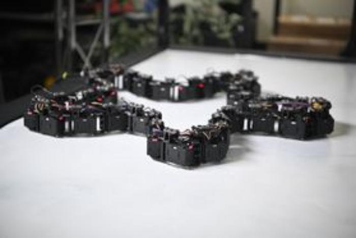 Loopy’s body is made up of 36 identical cells physically connected in a circle. Each cell can control its own movement, and each cell has sensors that keep it informed about its joint angle as well as external stimuli like light and temperature.