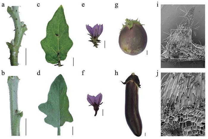 Morphological characterization of prickle in eggplant. a–h Phenotype comparison between two parental lines in different tissues: stems (a, b), leaves (c, d), flowers (e, f), and fruits (g, h) from the prickly eggplant ‘PI 381159’ and the prickleless eggplant ‘XQ23’, respectively. Black bars represent scales of 1 cm. i Scanning electron micrographs of longitudinally sliced prickles. j Magnified representation of the section highlighted by the white square in graph, illustrating the junction between the prickle and the stem epidermis. Black bars represent scales of 1 mm (i, j).