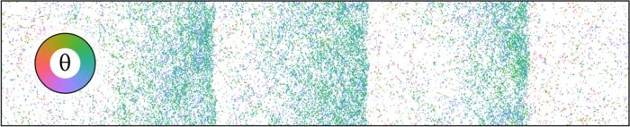 In a model of self-propelled particles aligning with their topological neighbors, one observes the formation of traveling bands (in green), typical of discontinuous transitions. The particle colors encode their orientations.