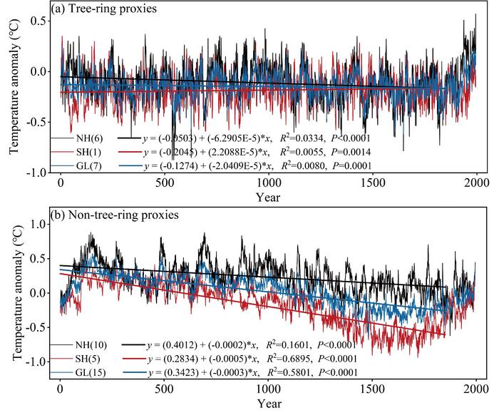 (a) Tree-ring based annual temperature reconstructions for the global (GL), Northern Hemisphere (NH), and Southern Hemisphere (SH). (b) Non-tree-ring based reconstructions for the same spatial domains.