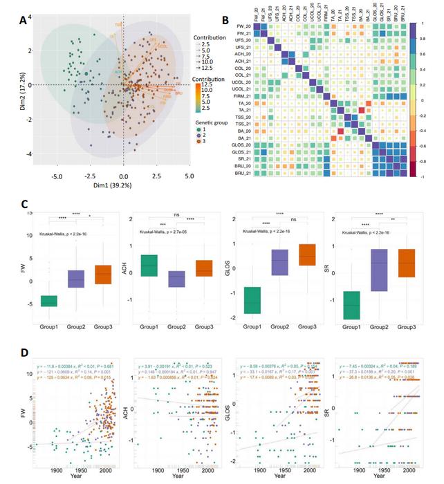 Phenotypic variations across the three genetic groups of the panel.