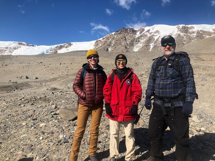 (From left) Ph.D. candidate Sarah N. Power, graduate student Meredith Snyder, and Professor J.E. “Jeb” Barrett, in Taylor Valley, one of the McMurdo Dry Valleys in Antarctica, in January 2023. Power and Snyder, along with Barrett, are among the authors of the Earth’s Future journal article.