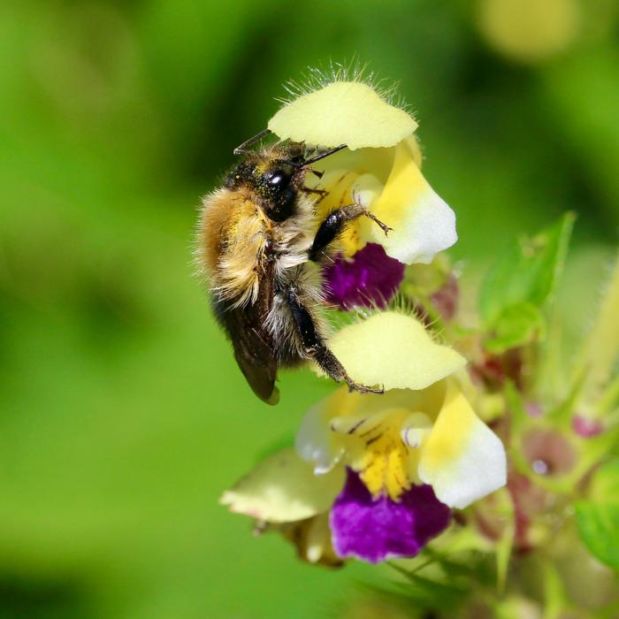 The common carder bee (Bombus pascuorum) feeding on the large-flowered hemp-nettle (Galeopsis speciosa) in the Austrian Alps. If it gets too hot, the insects can hardly detect the scents of the flowers.