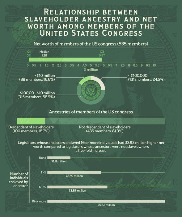 Statistical analysis of the data revealed that the net worth of US Congress members whose ancestors had 16 or more slaves was about five times higher than that of legislators whose ancestors did not have slaves—even after accounting for demographic factors that could also be linked to net worth, including age, sex, race, ethnicity, and education.
