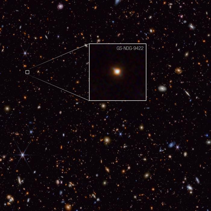 Caption: The newly-discovered GS-NDG-9422 galaxy appears as a faint blur in this James Webb Space Telescope NIRCam (Near-Infrared Camera) image. It could help astronomers better understand galaxy evolution in the early Universe.