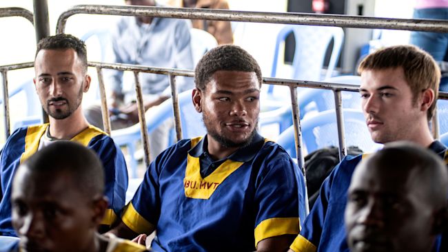 Benjamin Reuben Zalman-Polun, left, Marcel Malanga and Tyler Thompson, all American citizens, attend a court verdict in Congo.Credit: AP