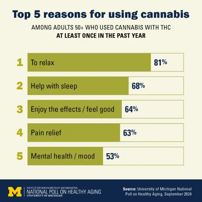 Key findings from the National Poll on Healthy Aging about the reasons for using cannabis cited by people age 50 and over who report using cannabis at least once in the past year.