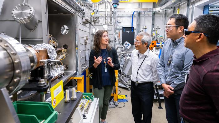 From left: Physicist and Group Leader Shelly Kelly describes the unique monochromator in the recently upgraded 25-ID beamline at the APS to Senior Chemist Zonghai Chen, Postdoc Jiyu Cai and Physicist Zhan Zhang.