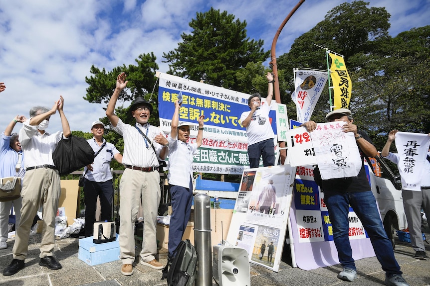 Supporters of Iwao Hakamada celebrated outside the Japanese court after the 88-year-old was acquitted of murder. (Kyodo via Reuters)