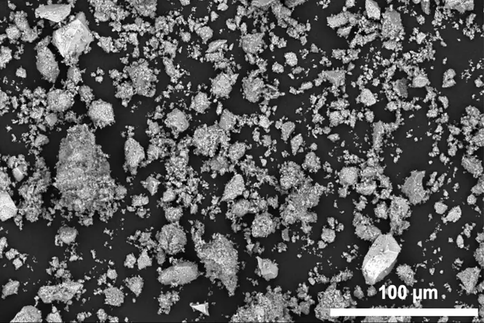 A new process for manganese-based battery materials lets researchers use larger particles, imaged here by a scanning electron microscope.