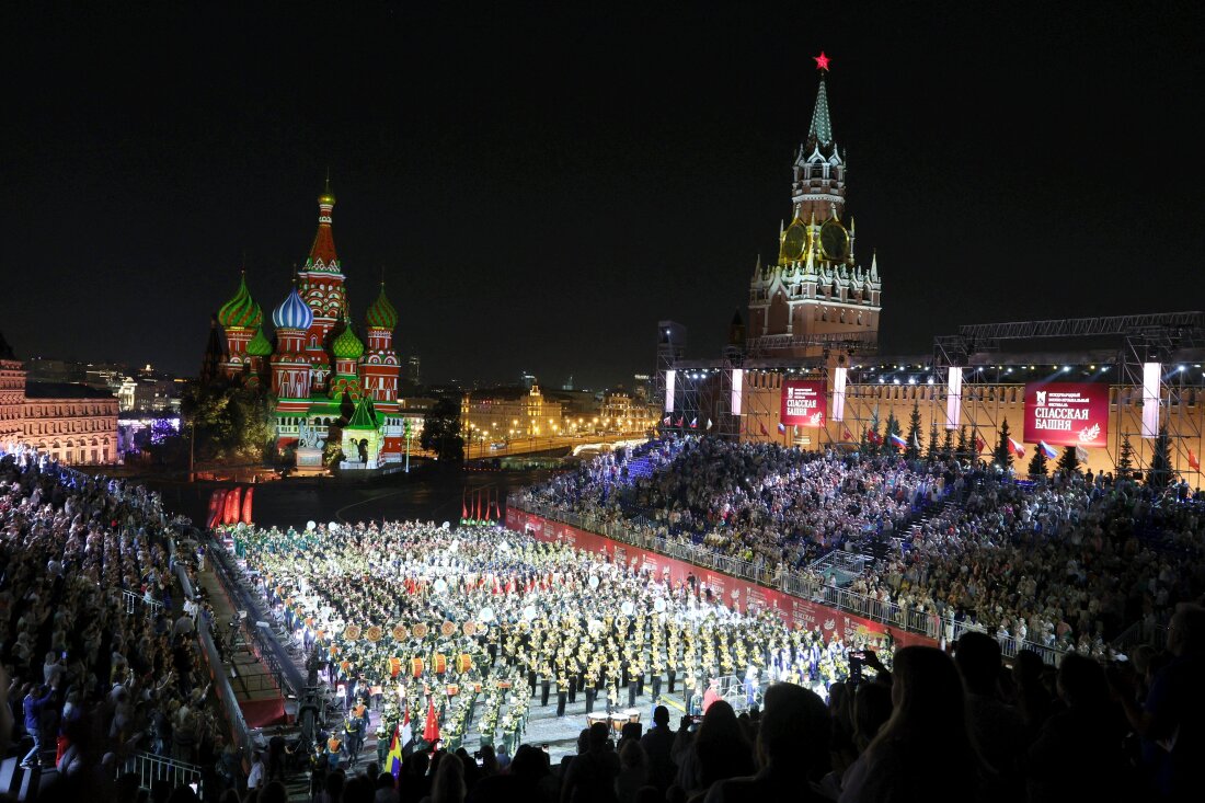 Military musicians perform in Moscow's Red Square on Sept. 1, 2024. Researchers at Microsoft say Russia is pivoting its online influence operations to focus on Vice President Kamala Harris and her running mate, Gov. Tim Walz of Minnesota, in the final stretch of the election.Stringer/AFP via Getty Images/AFP
